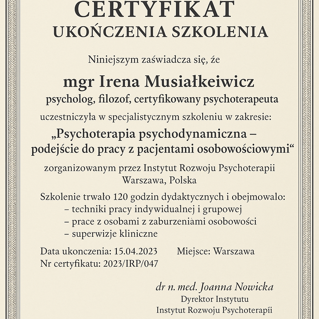 Irena Musiałkiewicz – psycholożka, psychoterapeutka psychodynamiczna